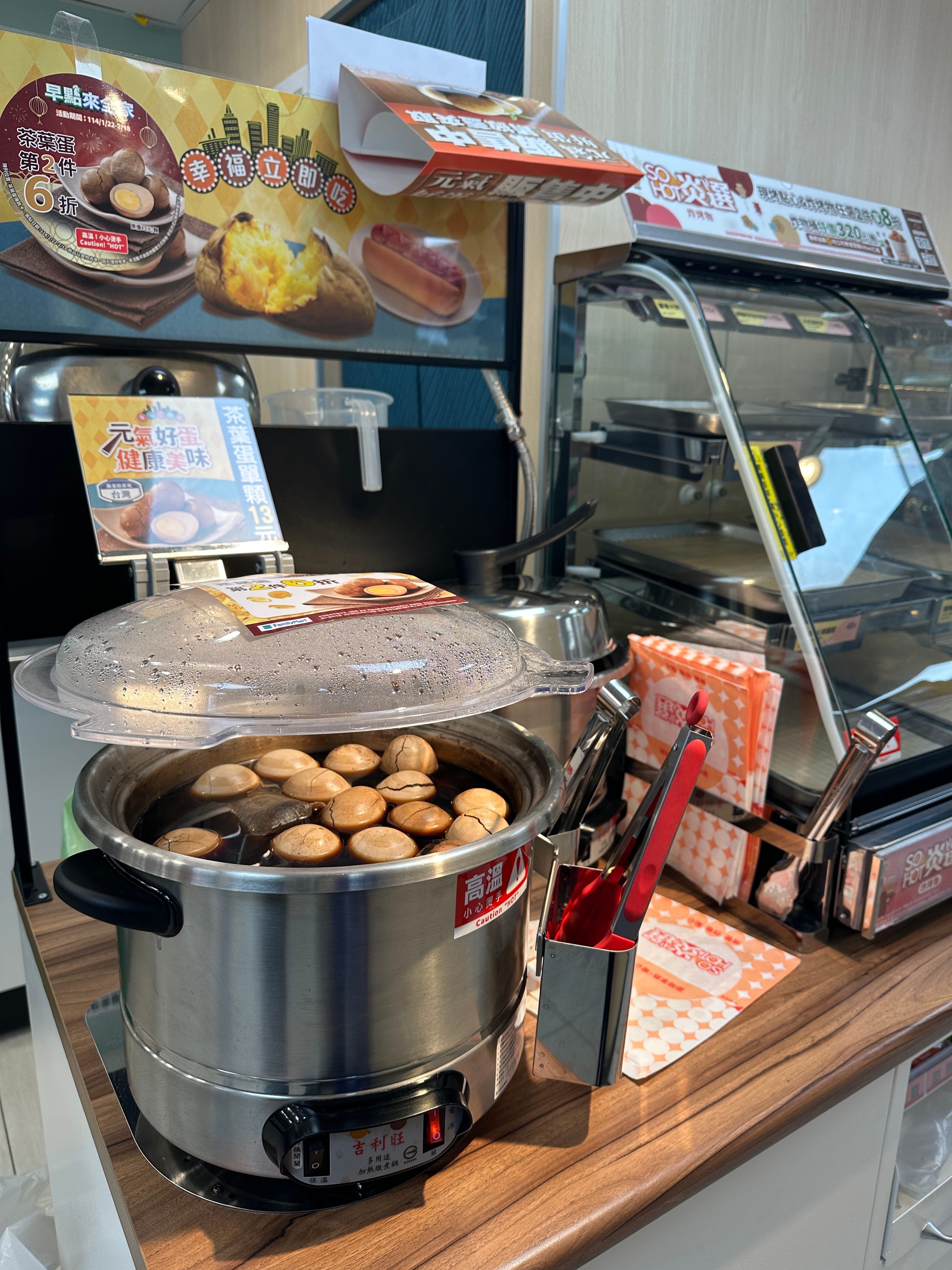 Inside, a microwave hums, heating a plastic tray of rice. In the glass steamer, sweet potatoes glisten under the golden light from a heat lamp. Eggs float in a liquid as dark as forgotten tea, their shells cracked like ancient maps, promising a taste as mysterious as their color.