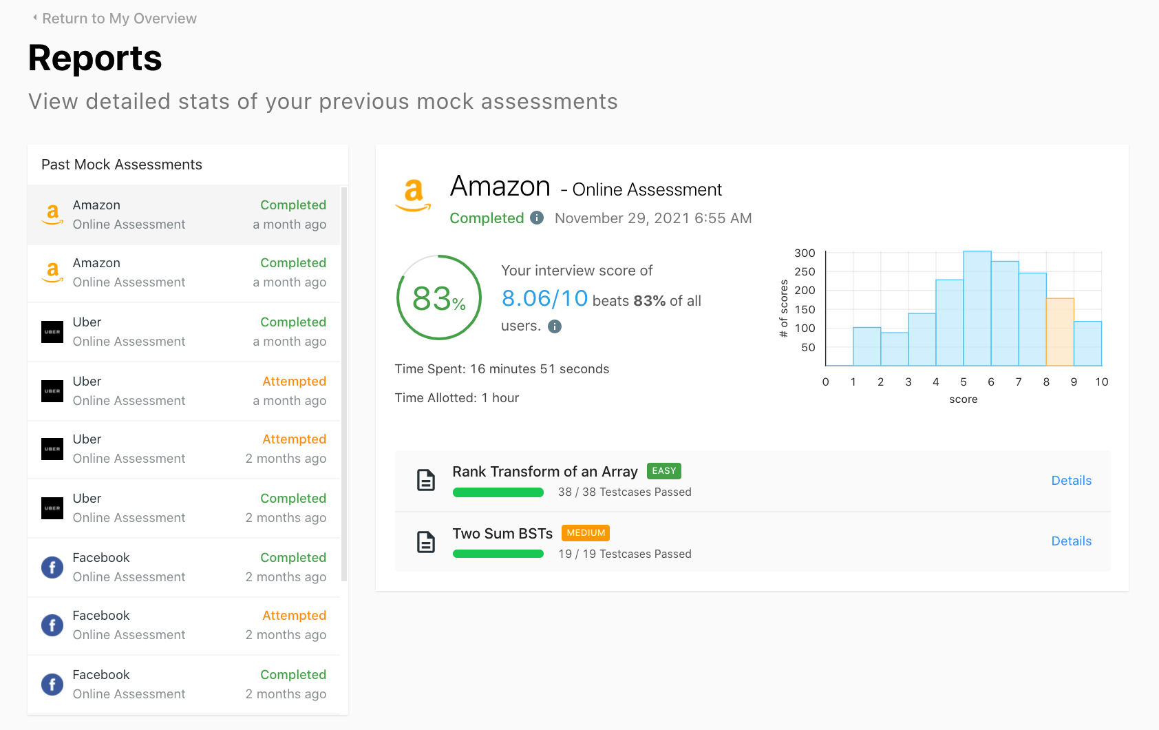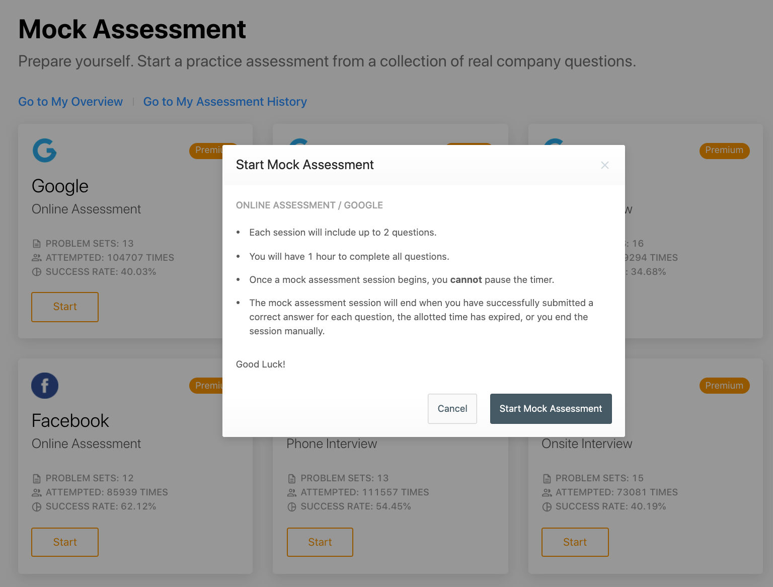 Once you click the start button, there is no coming back. No pause, no bathroom break, no choosing the category or difficulty of the problems. Exactly as a real interview would be.