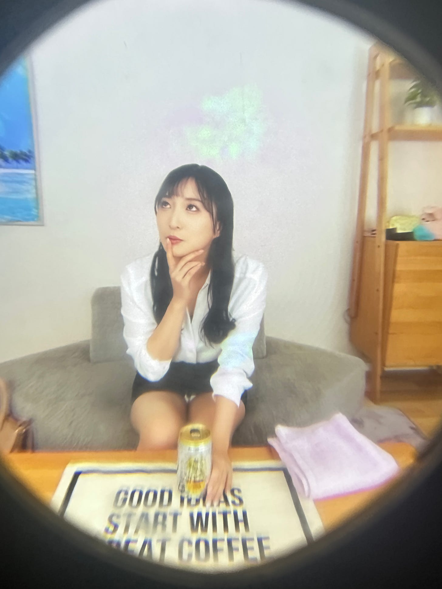 Her legs part on the couch, black skirt sliding up her smooth thighs, teasing me slow. Her white blouse loose, hinting at her chest, feels good, too good already.